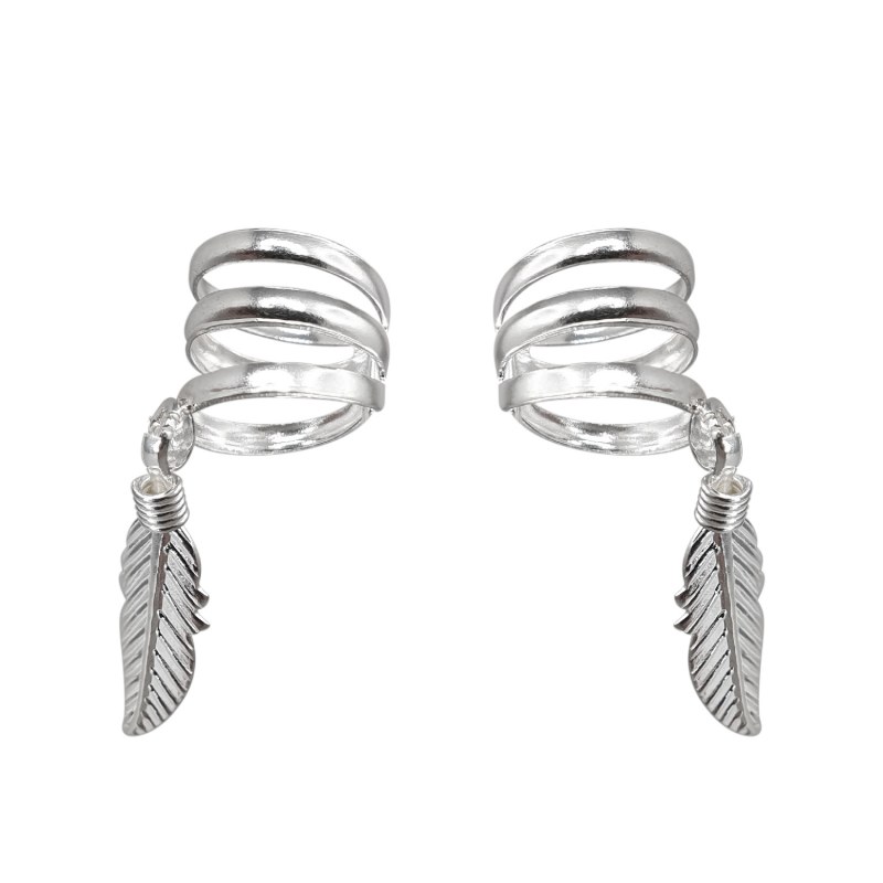 Aro bidú ear cuff tres líneas lisas con pluma colgante plata 925