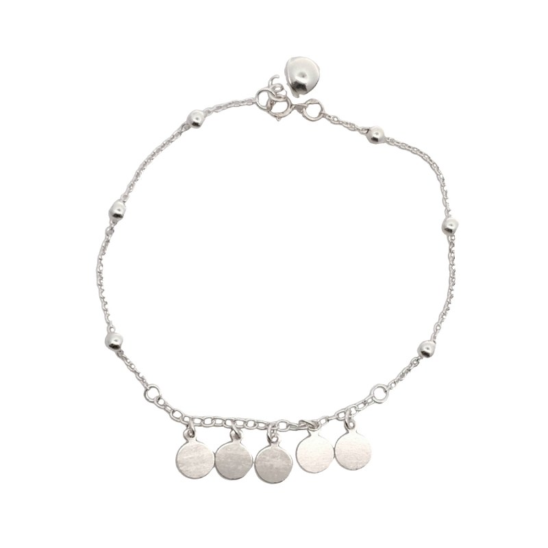 Pulsera circulos bolitas colgantes y cascabel 20cms Plata 925